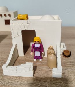 Una casa de estilo tradicional diseñada a escala Playmobil, perfecta para complementar tu belén navideño. Casa hecha en 3D en color marfil con PLA alta calidad ideal para dioramas. No incluye figura ni objetos externos a la casa. Se hacen lotes con descuento. Tamaño: 10,5 x 14 x 10 cm  (profundidad x ancho x alto)