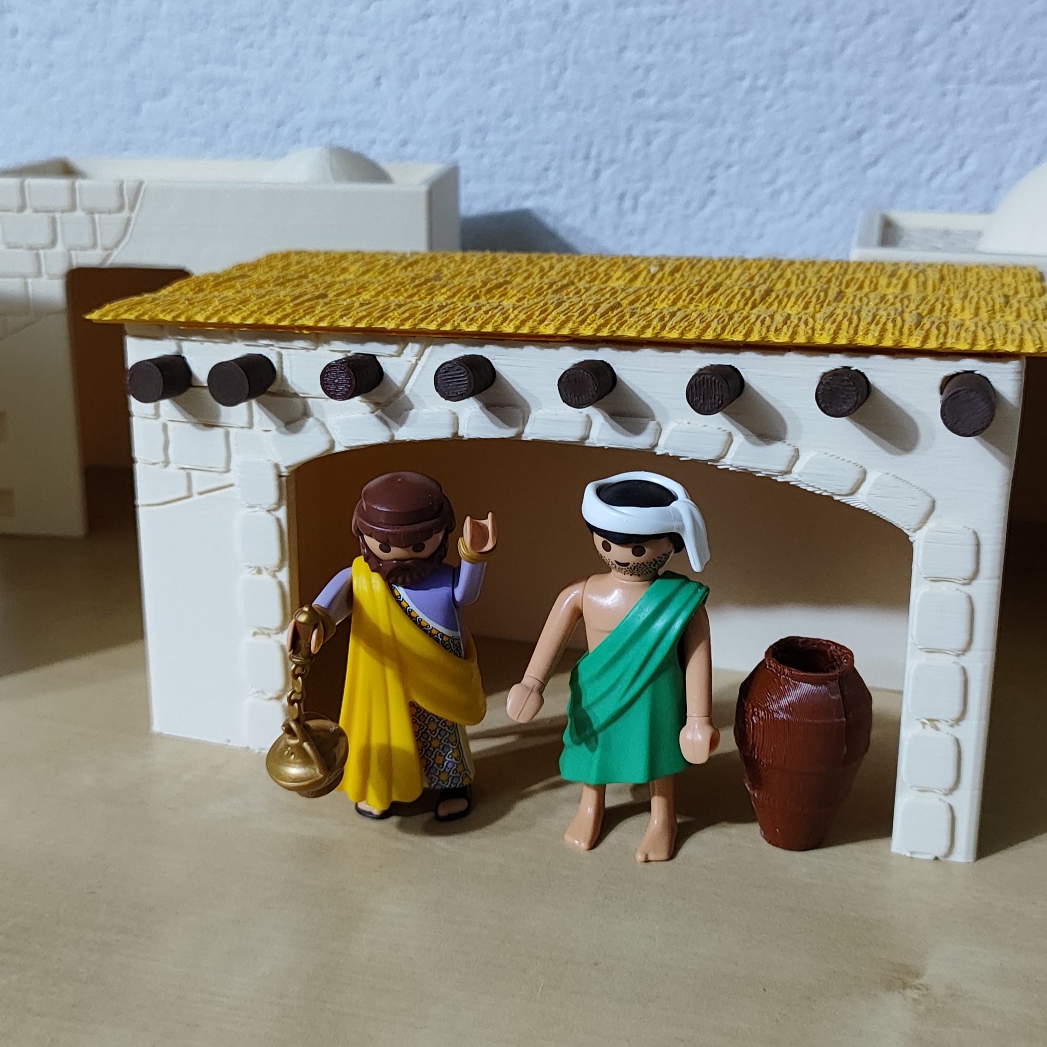 Establo de 18 cm de ancho por 10 cm alto, fabricado en 3D PLA color marfil y techo color paja y bigas de madera No incluye figuras ni objetos Establo v4