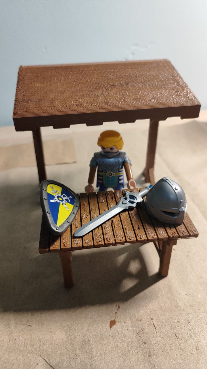 Mercado 3D en color madera con PLA alta calidad ideal para Belén a escala playmobil, también ideal para dioramas. Se incluye mesa y cajas. No se incluyen figuras ni objetos externos. Mas playmobil y 3D en mi perfil. Se hacen lotes con descuento.