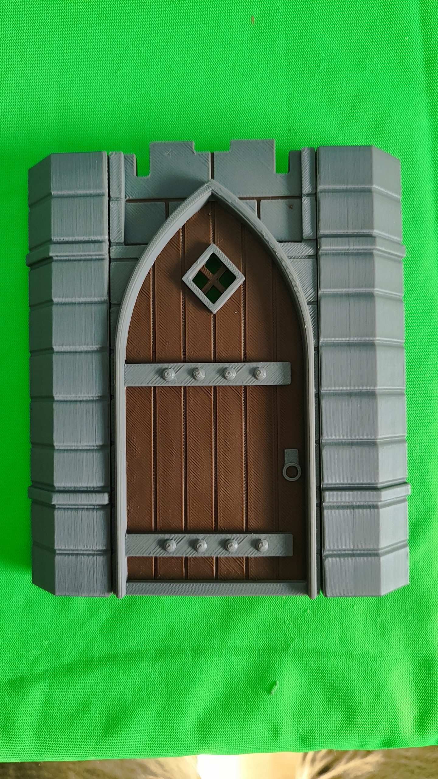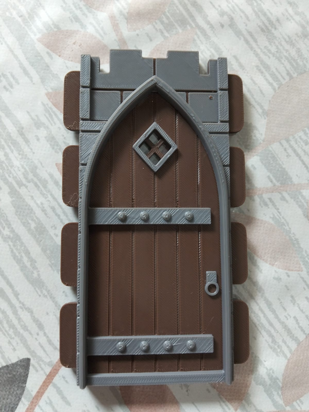 Muro de ladrillo con puerta medieval individual hecho en 3D de color gris y madera con PLA alta calidad ideal para dioramas a escala playmobil. No incluye figura ni objetos externos a la casa. Se hacen lotes con descuento. Encaja en sistema steck perfectamente. No incluye los conectores de ángulo de la foto.