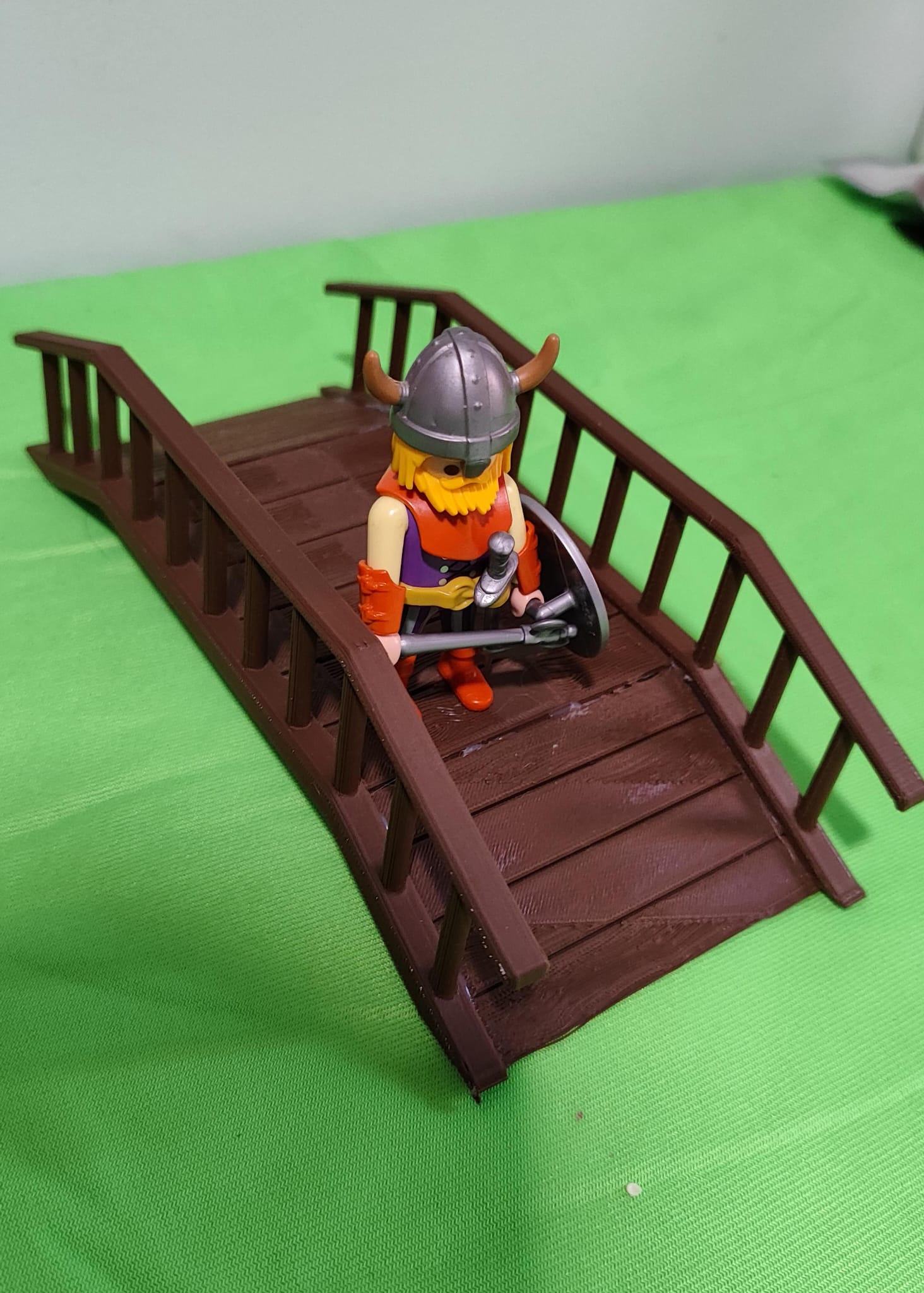 Puente ideal para dioramas O belén a escala playmobil hecho en impresora 3d con cable PETG imitacion madera, material especialmente resistente y duro. Mas Playmobil y 3d en mi perfil. No se incluye la figura