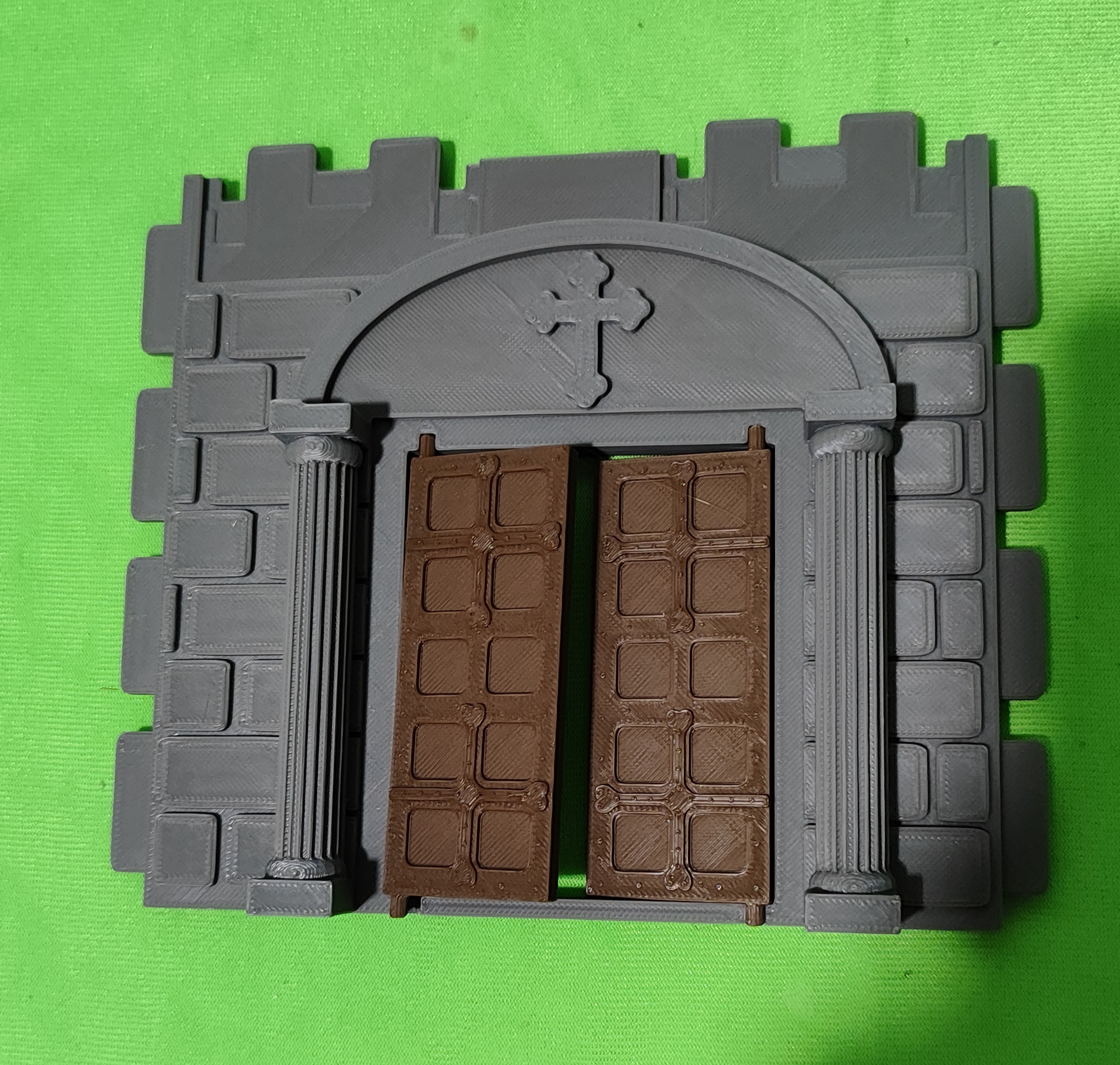 Puerta catedral o Iglesia doble pieza en 3D de color gris y puertas en madera con PLA alta calidad compatible con steck ideal para dioramas a escala playmobil. Se hacen lotes con descuento.